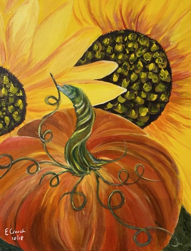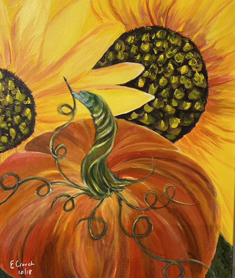 “Sunflower and pumpkin – acrylic on canvas, 40x50cm. Original Australian art flower painting available as print and commission.