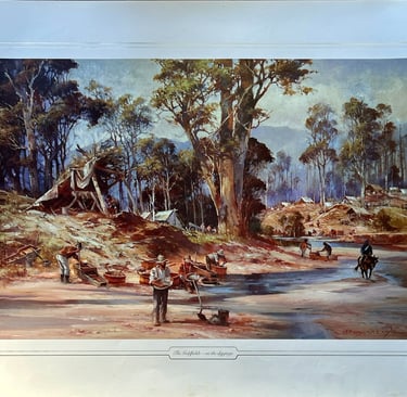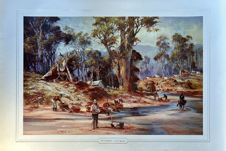 Released in 1988 to celebrate Australia’s Bicentenary, this work showcases Doyle’s signature style — vibrant colours, dynamic brushwork, and evocative storytelling — bringing to life the toil and triumph of the Gold Rush era.