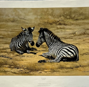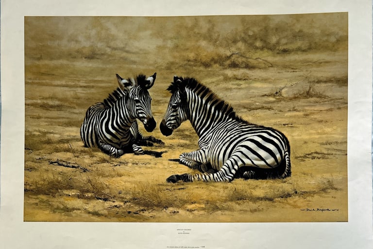 This sale is for an ORIGINAL David Shepherd print, African Children. The print showcases Shepherd's renowned talent for depicting wildlife with a focus on the beauty and innocence of nature. The artwork captures a tender moment with zebra foals, conveying a sense of harmony and connection between the African children and the animals.